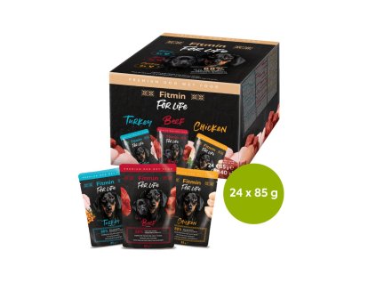Fitmin For Life Multipack kapsiček pro psy nabízí 24 lahodných kapsiček s kousky masa ve filetkách ve třech příchutích – s kuřecím masem, hovězím masem a krůtím masem.