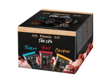 Fitmin For Life Multipack kapsiček pro psy nabízí 24 lahodných kapsiček s kousky masa ve filetkách ve třech příchutích – s kuřecím masem, hovězím masem a krůtím masem.