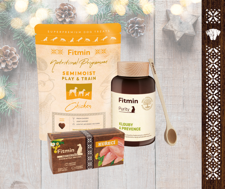 Vánoční balíček pro psy, co neposedí. Nepostradatelné trio poloměkkých pamlsků ve tvaru srdíček, hypoalergenní masové Stripes bez chemie a doplněk stravy pro zdravé a silné klouby. V dárkovém balíčku najdete balení Fitmin Nutritional Program Play and Train, Fitmin Purity Snax Stripes a doplněk stravy Fitmin Purity Klouby a prevence.
